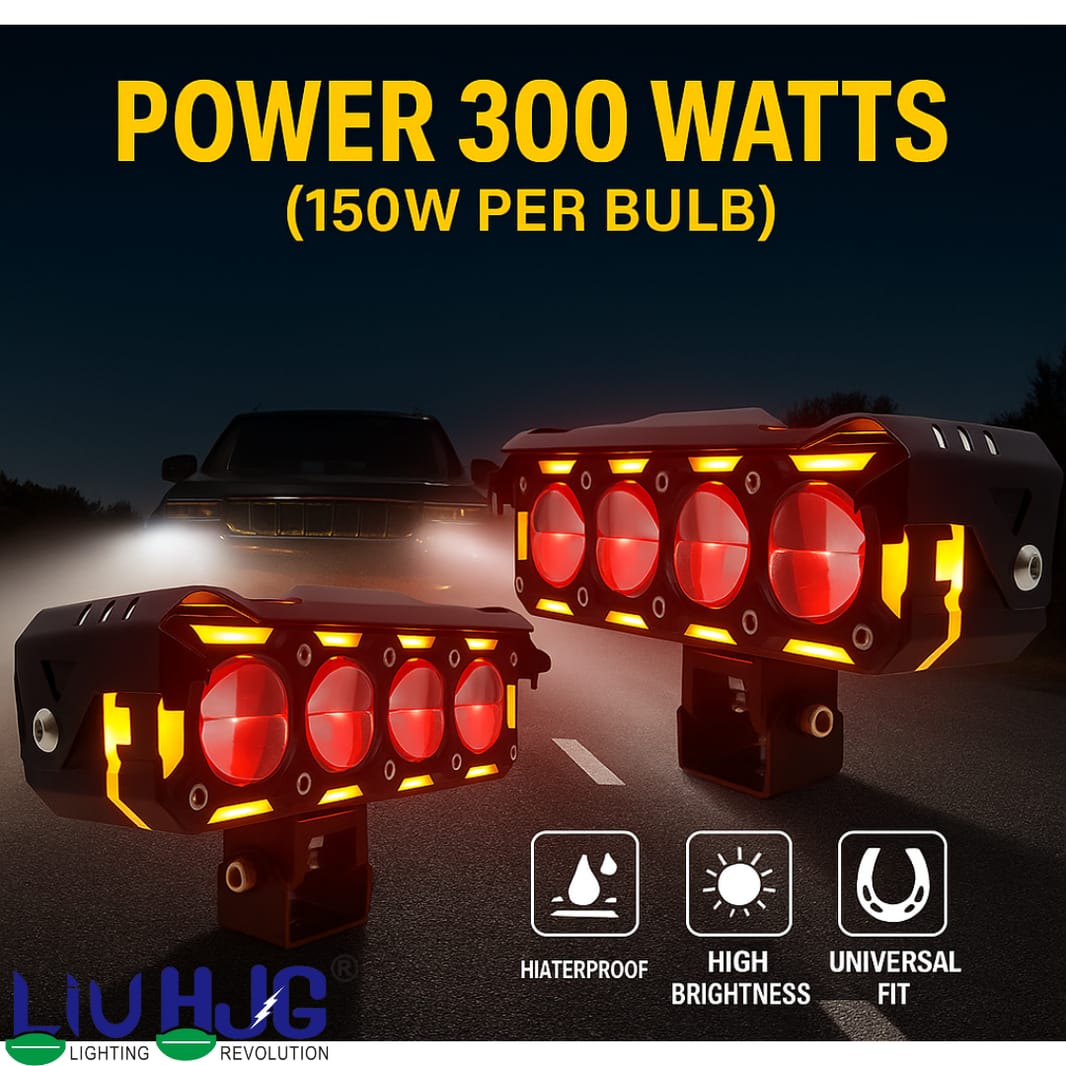 LIU HJG Dual Cut Lens 4 Lens LED Fog Light With Wiring Kit Waterproof & Dustproof 300W 12V DC Power Yellow, White, Red Devil Eye Light, Yellow DRL Universal fit for All Bikes & Cars (Pack of 2)